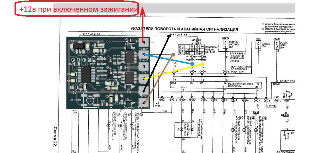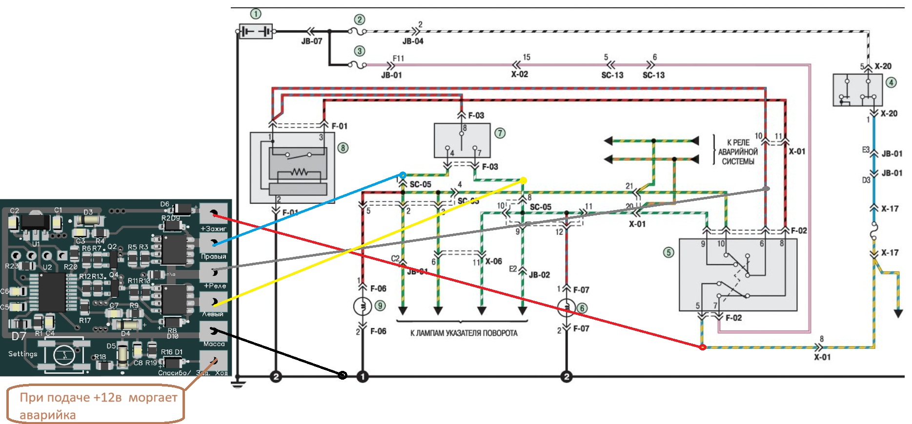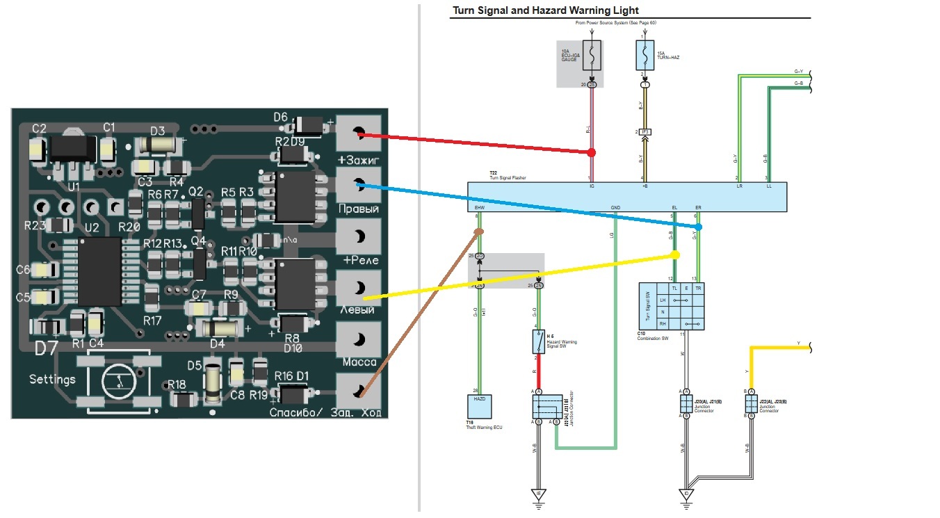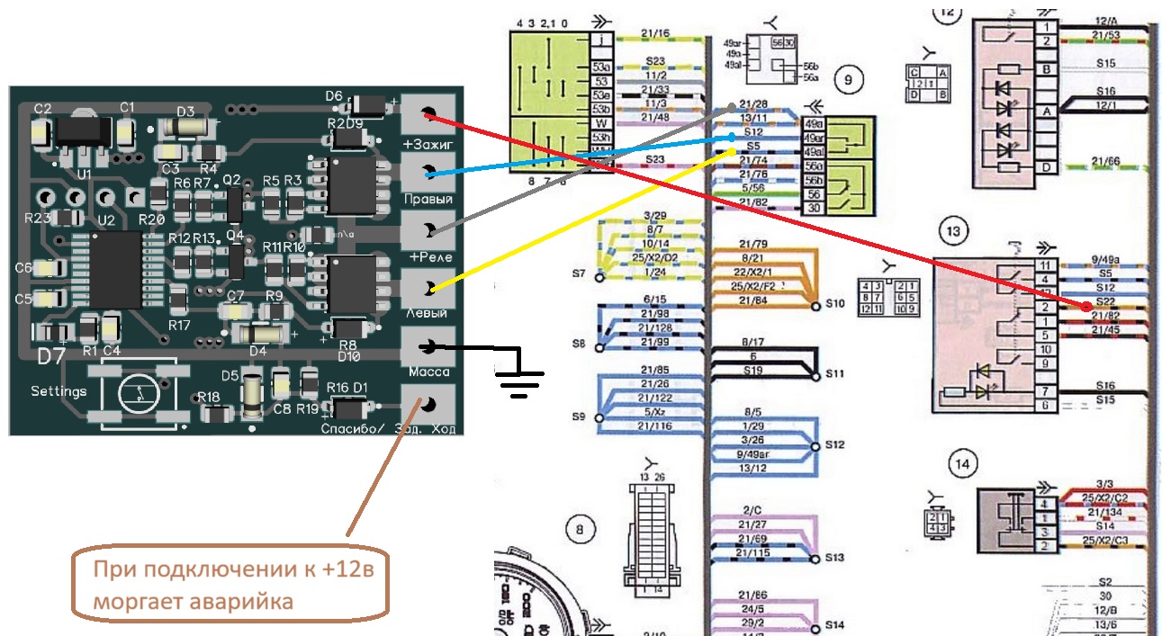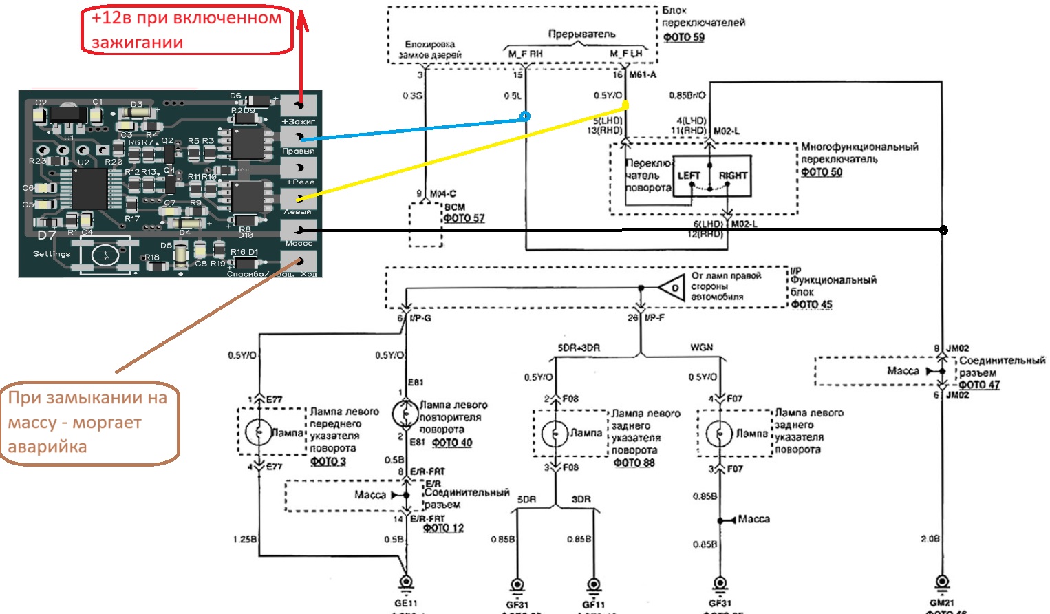 Правый и Левый — эти выводы подключаются прямо на лампы поворотников, либо на подрулевой переключатель в зависимости от марки автомобиля.