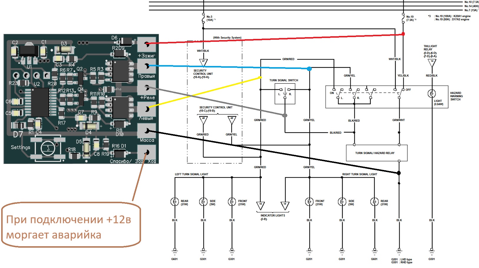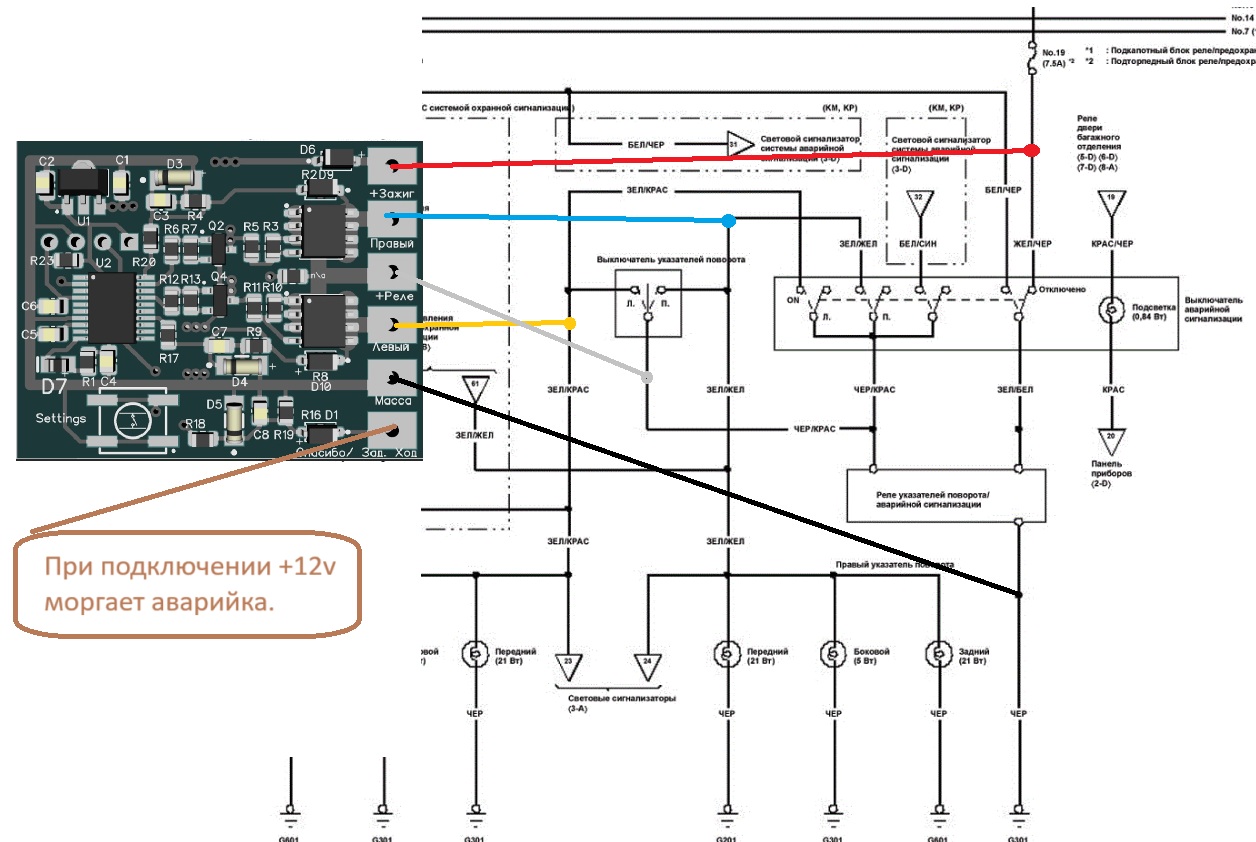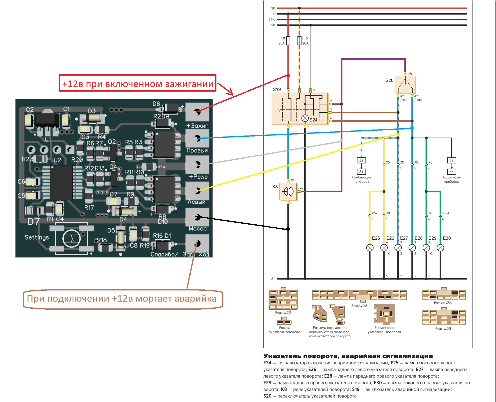 Правый и Левый — эти выводы подключаются прямо на лампы поворотников, либо на подрулевой переключатель в зависимости от марки автомобиля.